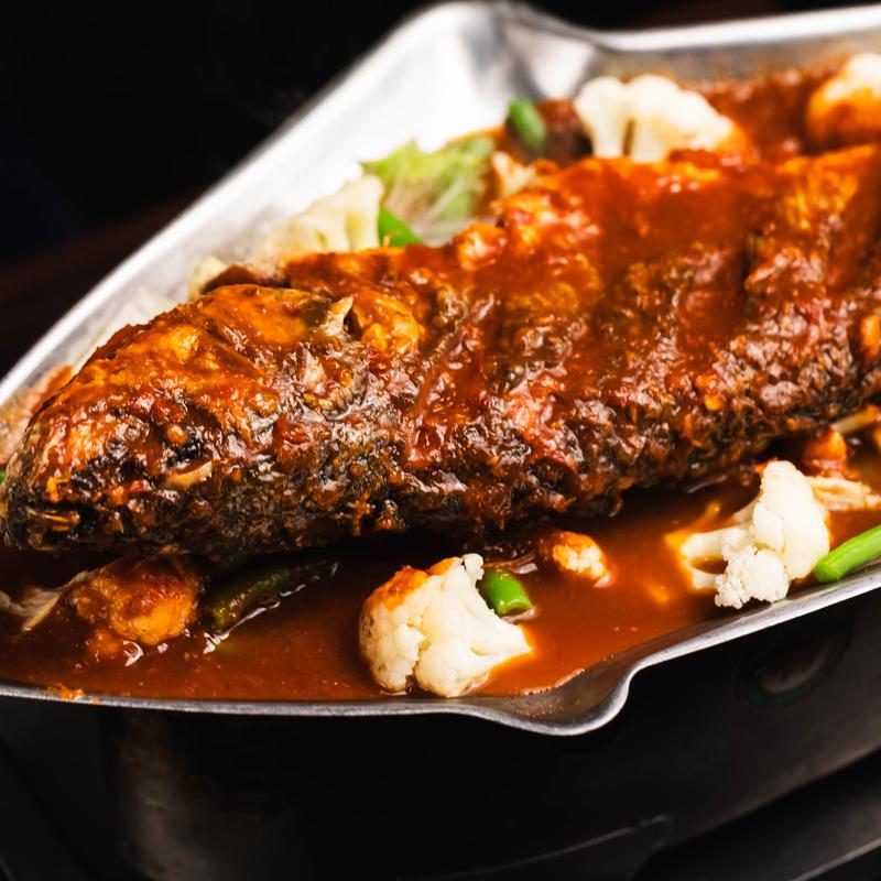 Crispy whole branzino in spicy and sour fish curry with cauliflower, string bean, and napa cabbage.