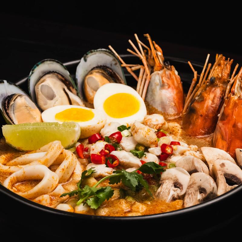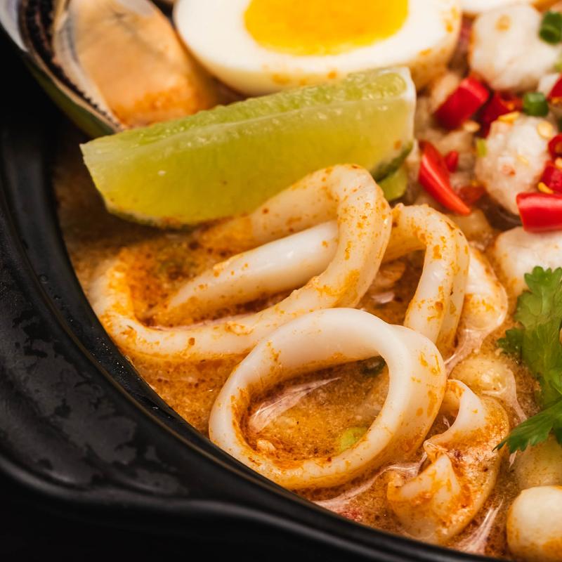 Creamy tom yum noodle soup with crab meat, fish ball, jumbo prawn, mussel, calamari, boiled egg, mushroom, yellow noodle.