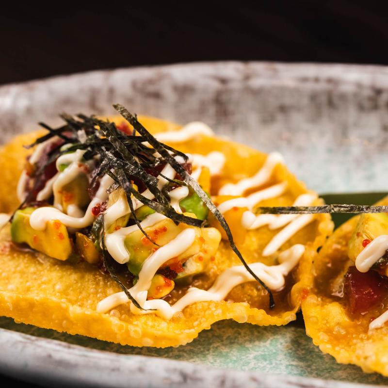 Crispy Thai pork belly atop Japanese rice bowl. Served with sauce trio: tamarind, spicy lime and sweet soy.