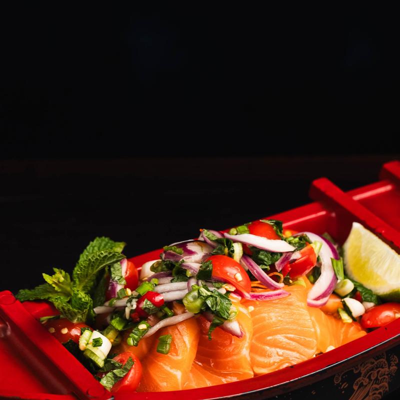 35 pieces salmon sashimi, 10 pieces salmon sushi, 5 salmon rolls.