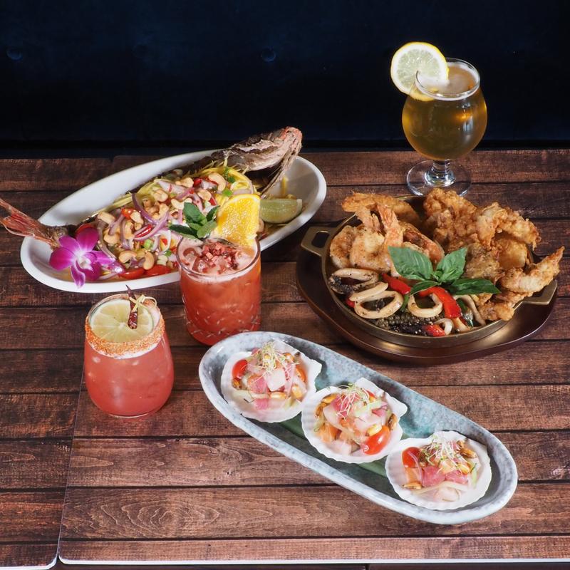 Tuna, Salmon, Yellowtail, celery, red onion, cherry tomatoes, Thai basil, crunchy corn, THai spicy seafood sauce.