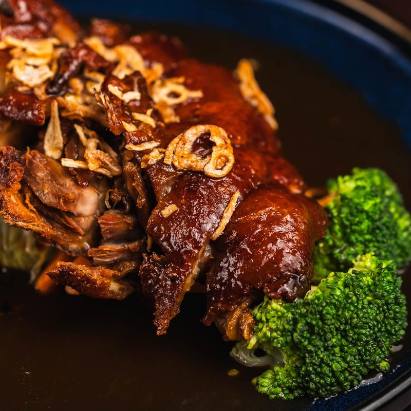 Half crispy duck on bed of steamed vegetables topped with tamarind reduction sauce and crispy shallot.
