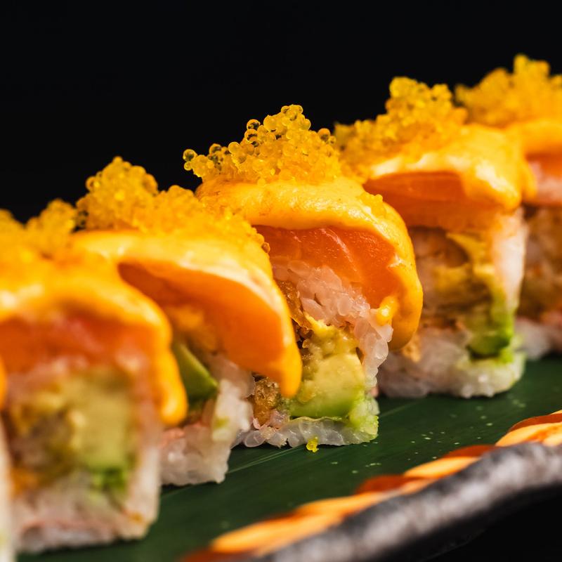 Shrimp tempura, avocado topped with torched salmon, spicy mayo, yuzu tobiko in a soybean wrap.