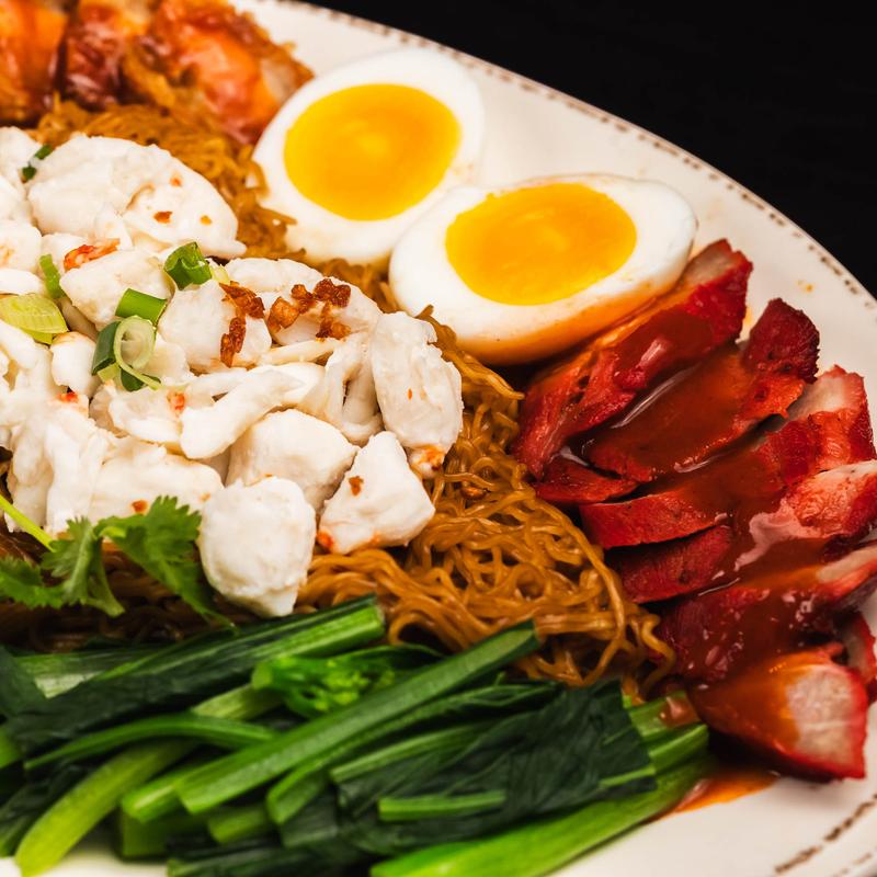 Dried steamed yellow egg noodle mixed with homemade black soy sauce with crab meat, crispy belly pork, roasted pork, steamed pork&shrimp wonton, choy sum, boiled egg.