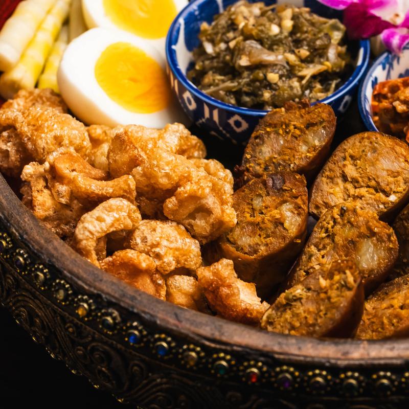 Northern sai oua sausage, pork crackling, Vietnamese style pork loaf, pork Jerky, chicken wings and egg with roasted green chili nam prik num and tomato and pork num prik ong. Served with cucumber and bamboo shoots for dipping.