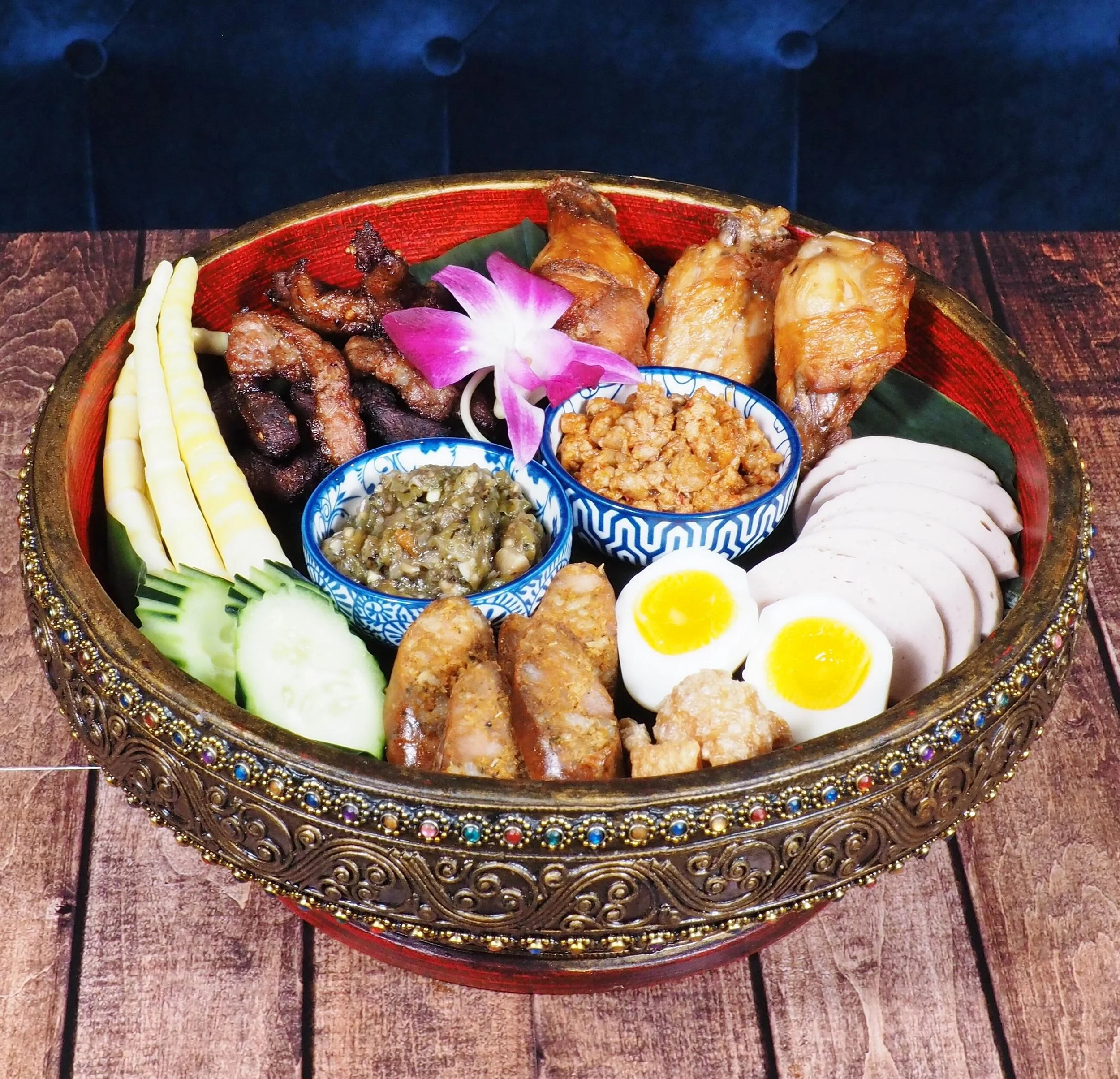 Northern sai oua sausage, pork crackling, Vietnamese style pork loaf, pork Jerky, chicken wings and egg with roasted green chili nam prik num and tomato and pork num prik ong. Served with cucumber and bamboo shoots for dipping.