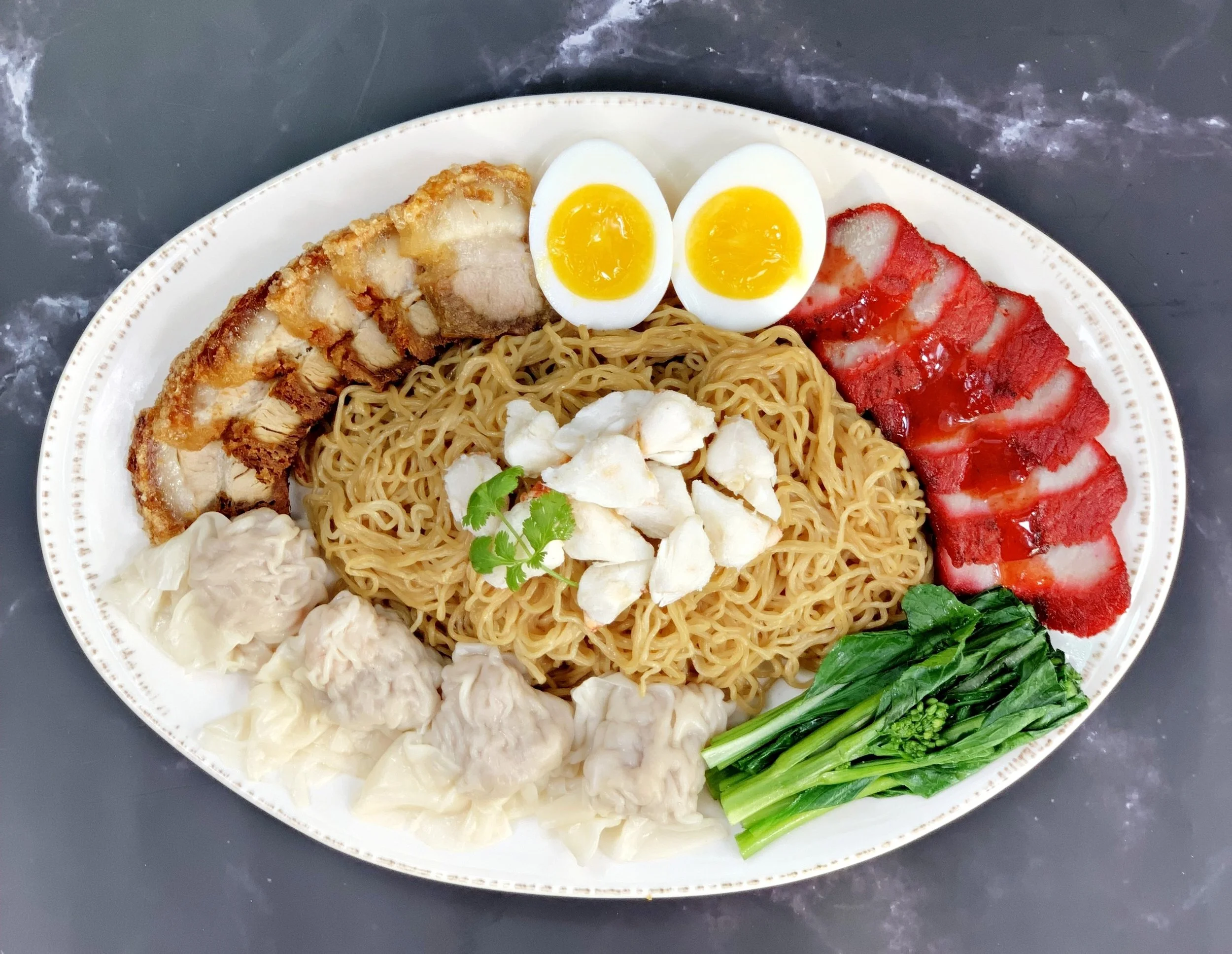Dried steamed yellow egg noodle mixed with homemade black soy sauce with crab meat, crispy belly pork, roasted pork, steamed pork&shrimp wonton, choy sum, boiled egg.