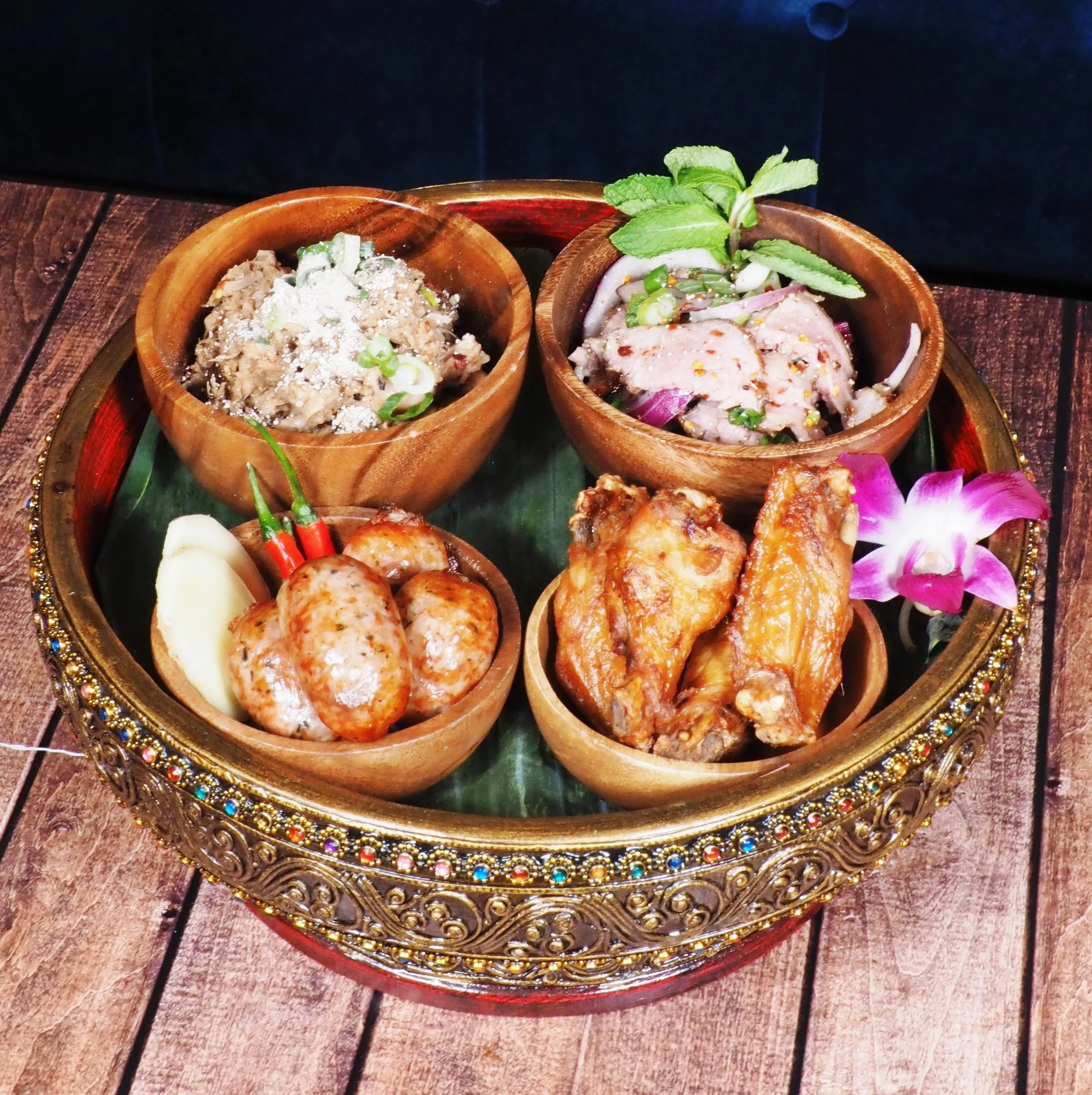 Saikrok E-San (4), Chicken wings (4), Nam Tok Moo (Grilled pork neck meat salad with shallot, scallion, mint, spicy roasted rice sauce), Soup Buk Mee (Young jackfruit dip with ground steamed makerel, chili, scallion, roasted rice)