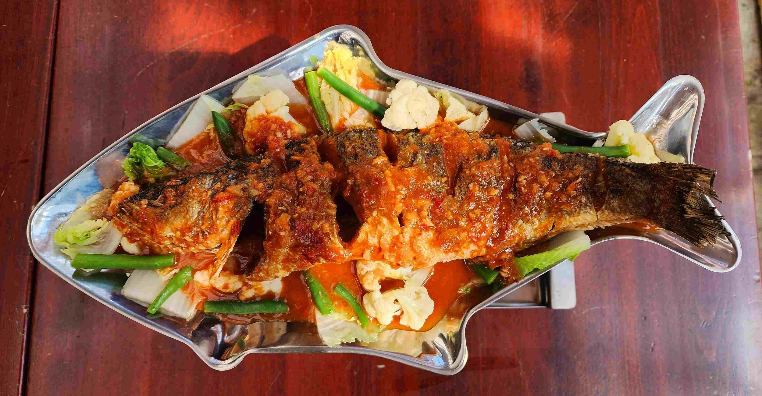 Crispy whole branzino in spicy and sour fish curry with cauliflower, string bean, and napa cabbage.